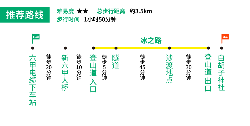 从六甲电缆下车站到冰之路登山口为止的路程必须沿着表六甲车道的旧路步行。一边注意安全一边步行于没有人行道的车道,路上您可以看到新六甲大桥。步行到登山口是,一定要注意交通安全哦!
