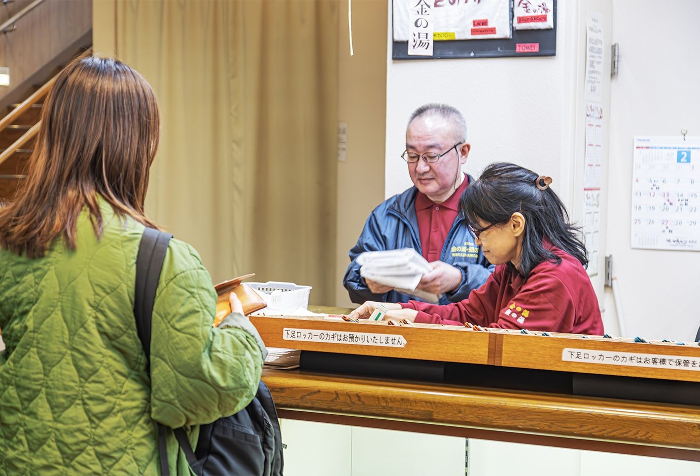 更衣室的更衣柜的钥匙请在1楼前台领取并返还。人多的周末时,可能需要排队。