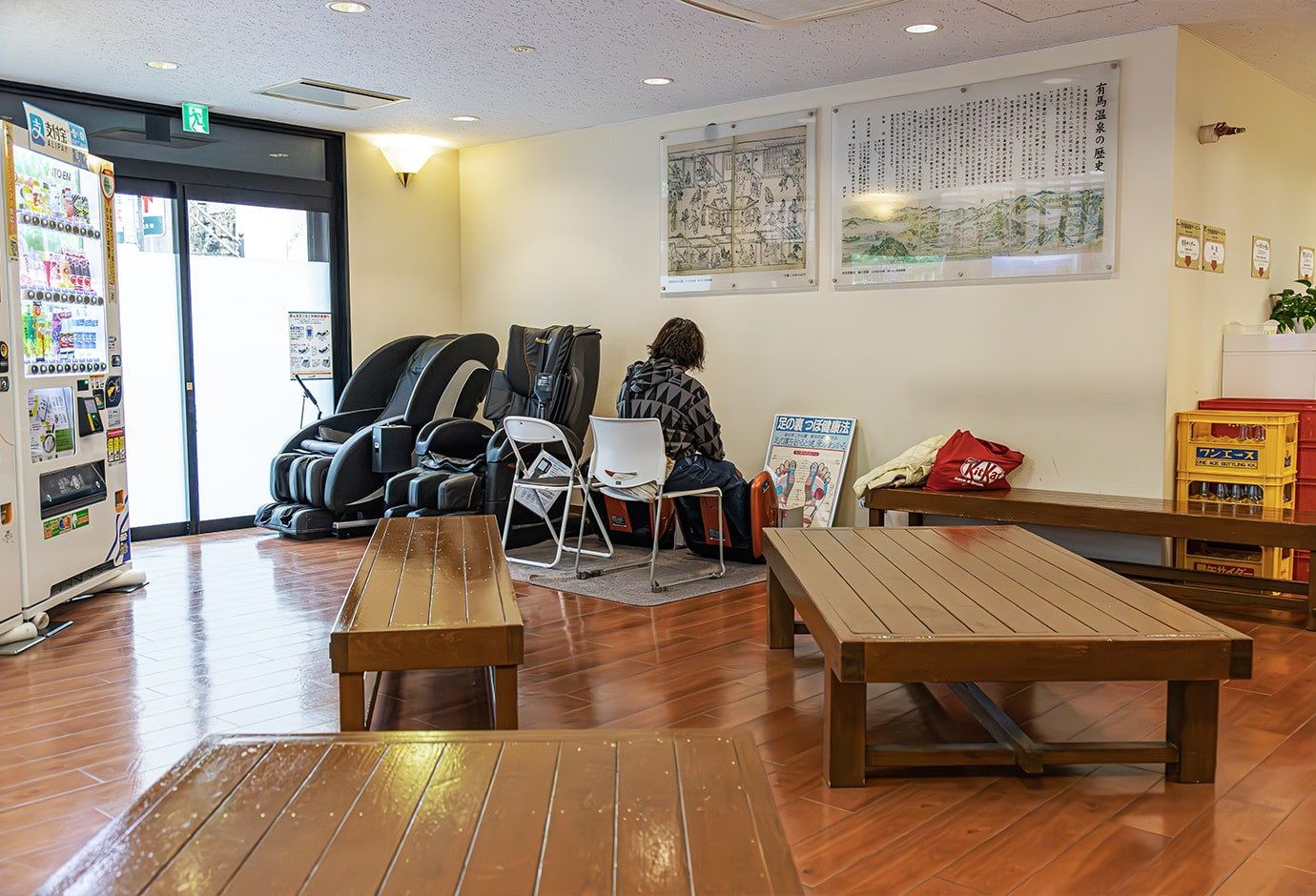 入浴后可以在休息大厅放松休闲。可以用按摩器材来恢复登山疲劳。还可以买到有马名产“有马汽水”。