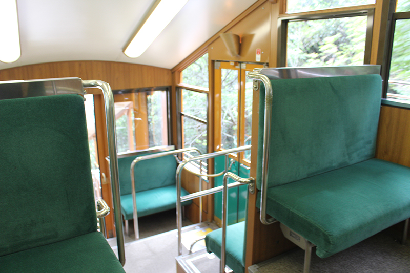 And we’re off! This is the interior of the “#2 Retro Style Car.” The seats in the upper car are made out of moquette (soft, velvety fabric). Furthermore, the carpeted floor lends to the calm, relaxed atmosphere.