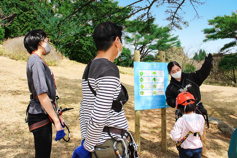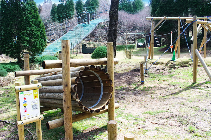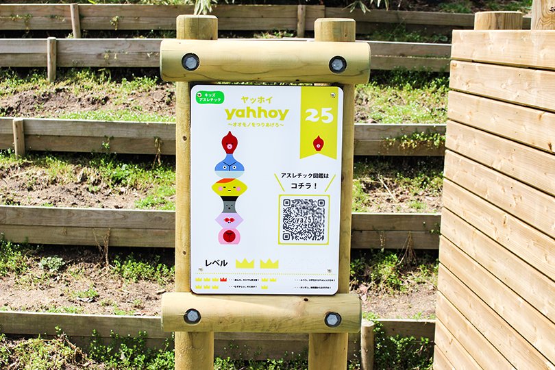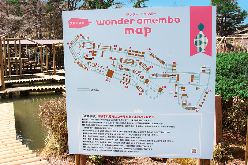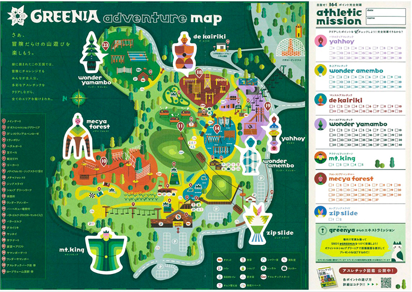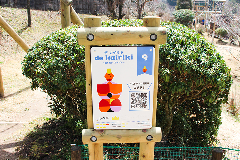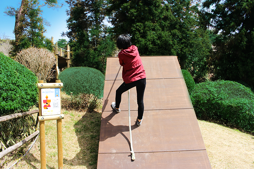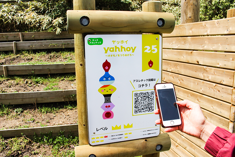 This iconic green-colored double-sided map contains sufficient information about GREENIA and it will help you find your favorite spots easily. Also, as you can use the checklist called “athletic mission” on the left side of the map, you will not miss the attractions that you would like to try in each area. And of course, the maps and the signboards are dotted all over the park, so you don’t have to worry about finding the right place. Moreover, in front of each attraction, there is a name board with a QR code. And like the photo shown below, you can easily scan it and access the detailed instruction page online called “Athletic pictorial book”. It would be a great idea to go to the page and check it out before trying the attractions.