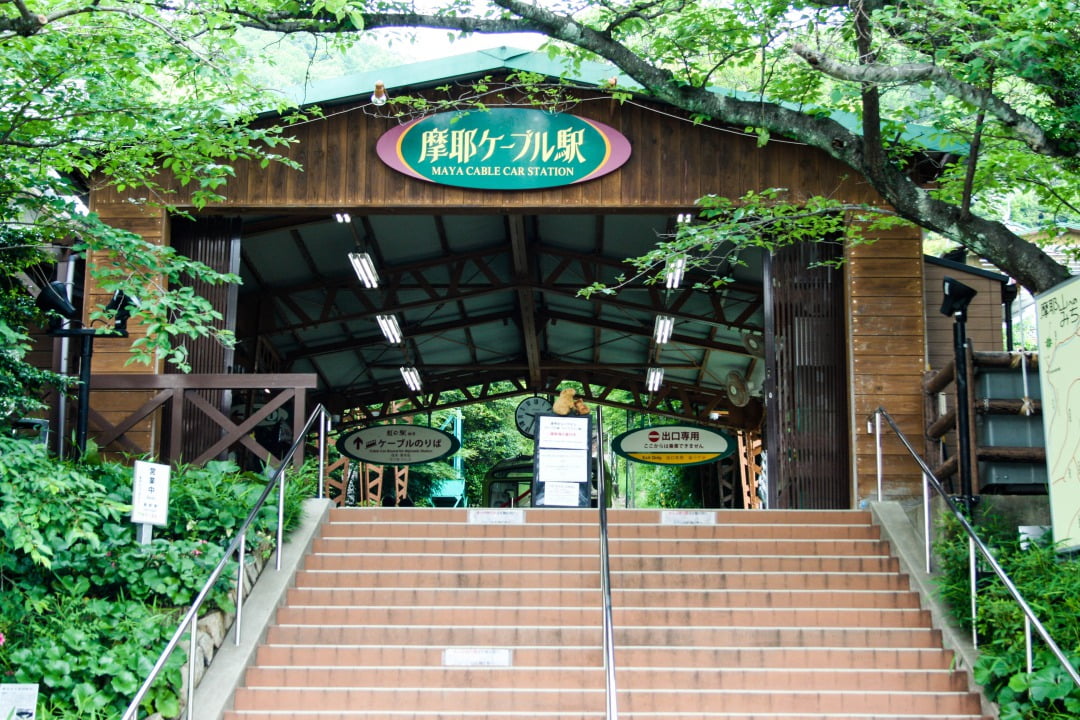 As the starting location and the first sacred spot, the choseki sotoba stone grave tablet is situated at Maya Cable Station. On the surface of the classic stone tablet, Sanskrit characters that show an eleven-faced Kannon Avalokiteshvara, are curved.A relaxing 5-minute Cable car trip takes you to the Niji no Eki Station.