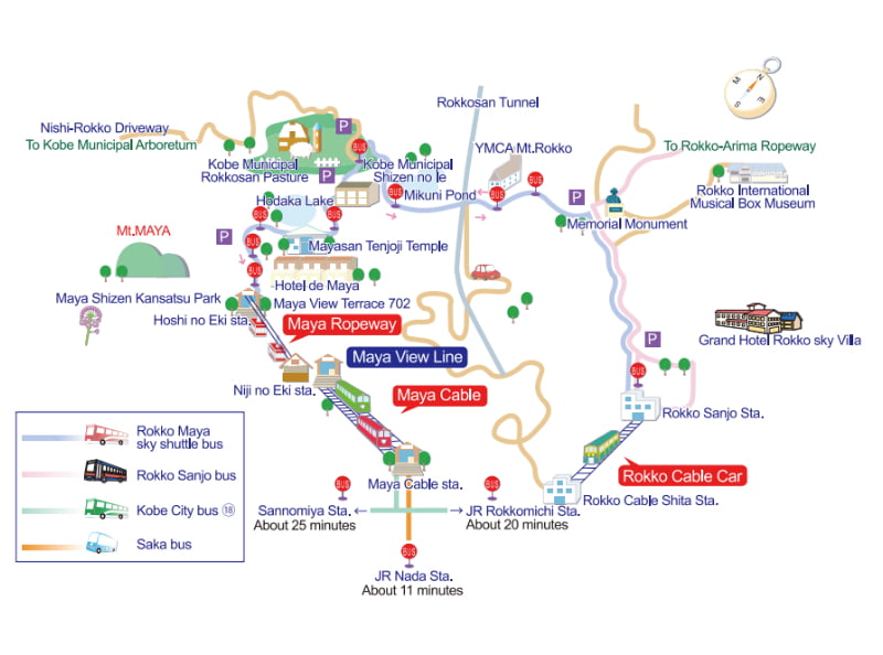 We took the Maya Cable car from Maya Cable Station to get to Niji no Eki Station. From Niji no Eki Station, we trekked to Maya Ropeway Hoshi no Eki station. After that, as well as walking we used bus services to reach the rest of the spots.(Source: https://koberope.jp/en/maya/price)