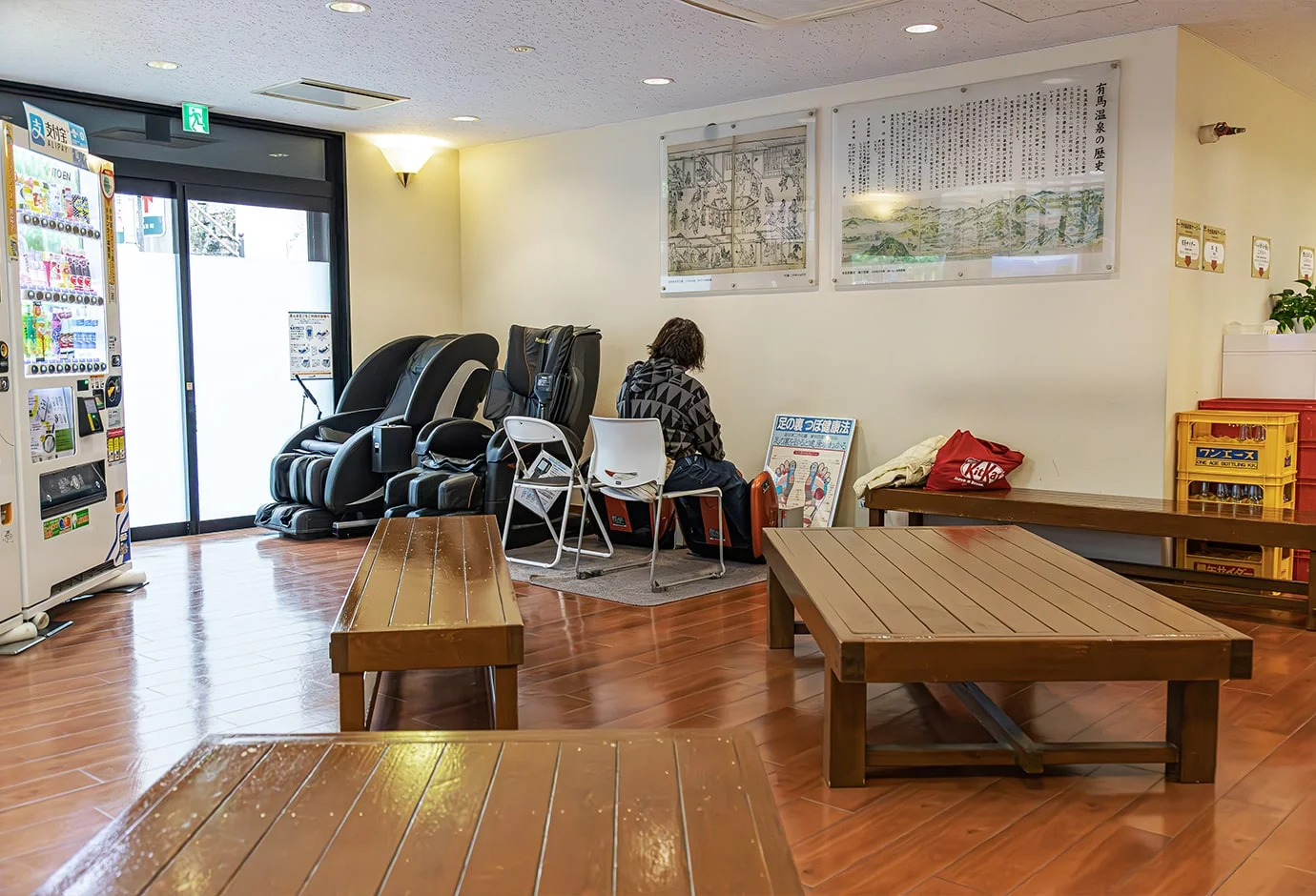 The rest lobby provides a space to relax after bathing. You can use the massage chairs to relieve fatigue from your hike. They also sell local Arima Cider.