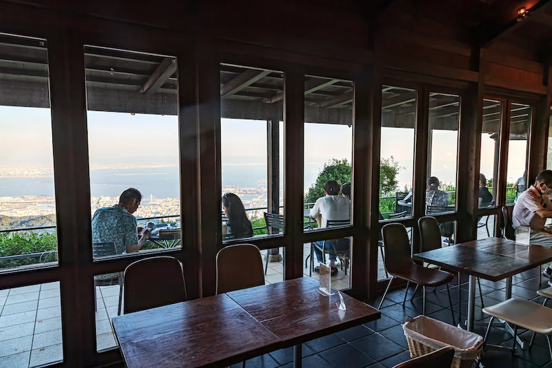 The open-air dining terrace (3 sections) would be the best choice to enjoy both great food and a wonderful view of Kobe and Awaji Island at once.