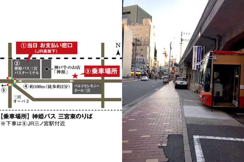 1: Ticket counter (under JR train tracks) 2: Shinki Bus Sannomiya terminal 3: East bus stop (as seen in the photo below.) 4: About 100m (two-minute walk) 5: JR Sannomiya Station