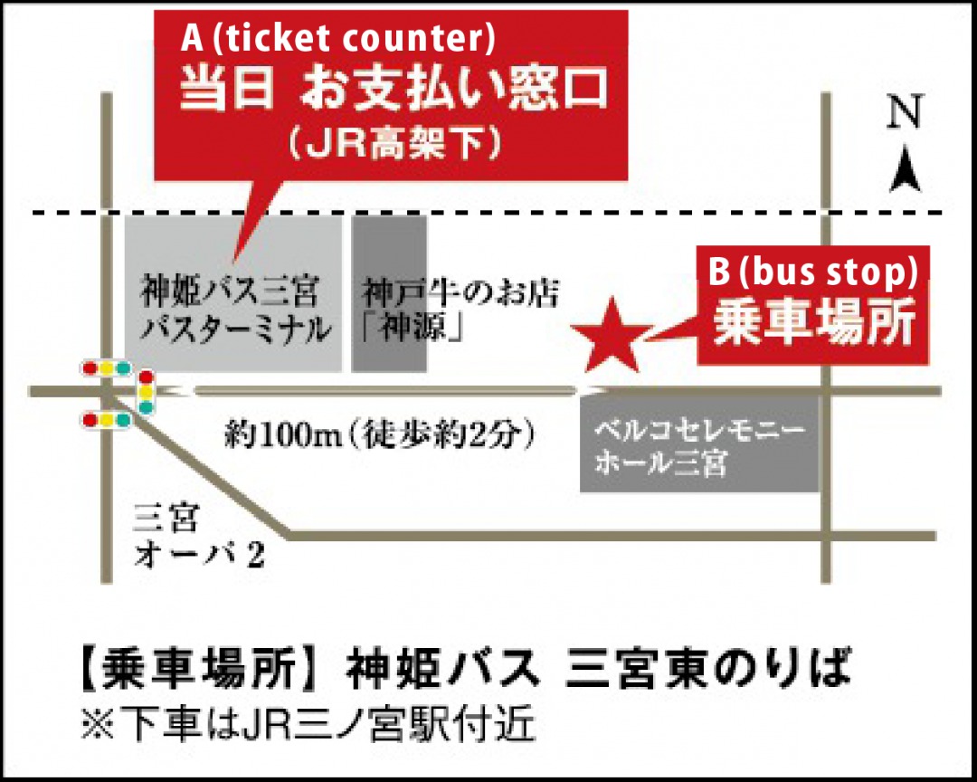 Please stop by the Ticket counter inside Shinki Bus Sannomiya Bus Terminal (A on the map below / Google map) and then proceed to the higashi bus stop (B on the map below) that is just 2 minutes away from the counter.