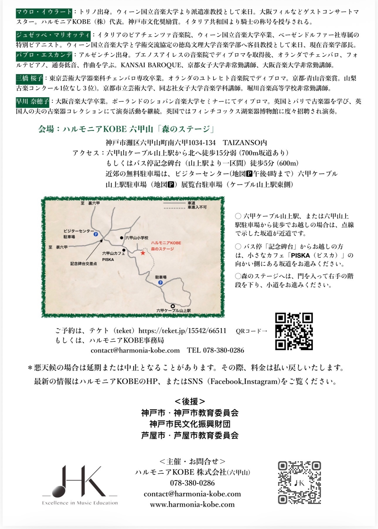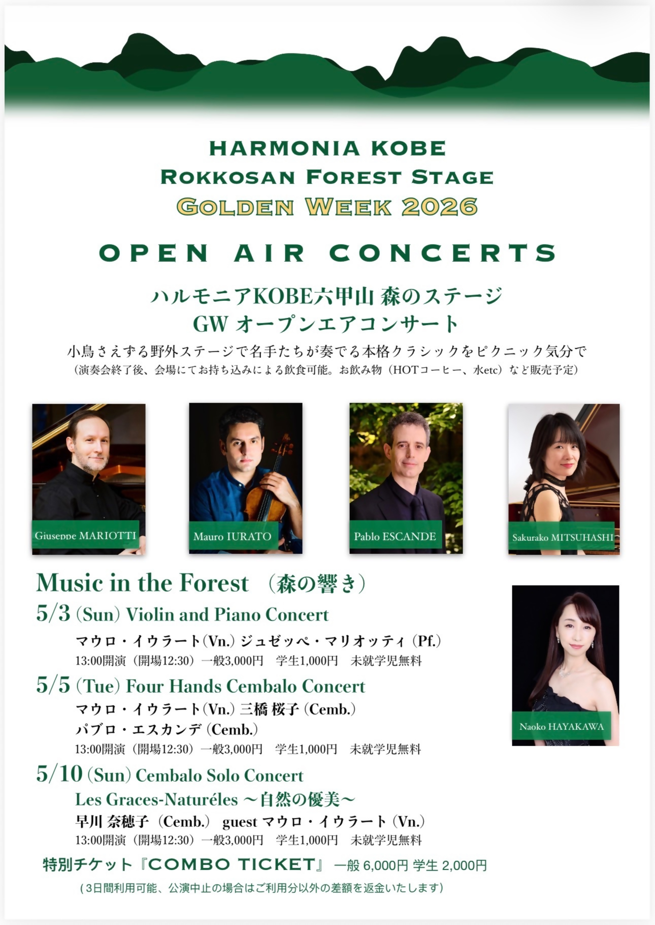 ヴァイオリンとピアノのデュオ、イタリアの作品を中心に映画音楽などポピュラーな曲も交えます。5日はヴァイオリンとチェンバロ。2台の鍵盤を使い特別のアレンジなど独創的なプログラムとなります。10日はチェンバロソロ、自然をテーマに選曲された美しいプログラム。鳥のさえずり、木漏れ陽、頬を撫でる風、六甲山の森が織りなす貴重な体験をピクニック気分で気軽にお楽しみいただけます。開放的なスペースでご家族連れ、小さいお子様も参加可能です。飲み物などの販売もあり、お弁当などの持ち込みも可能です。