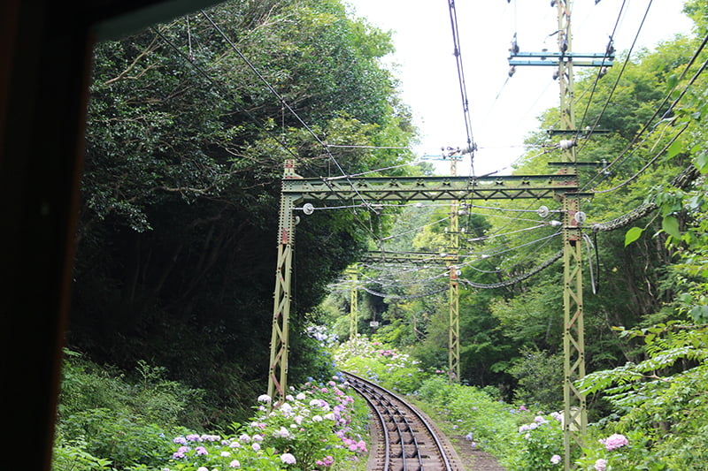 케이블카 진행방향 쪽으로 가장 윗 칸, 차장실 바로 옆 창문으로는 선명한 수국과 함께 저 멀리까지 이어지는 선로가 보여 기대감으로 두근거립니다.