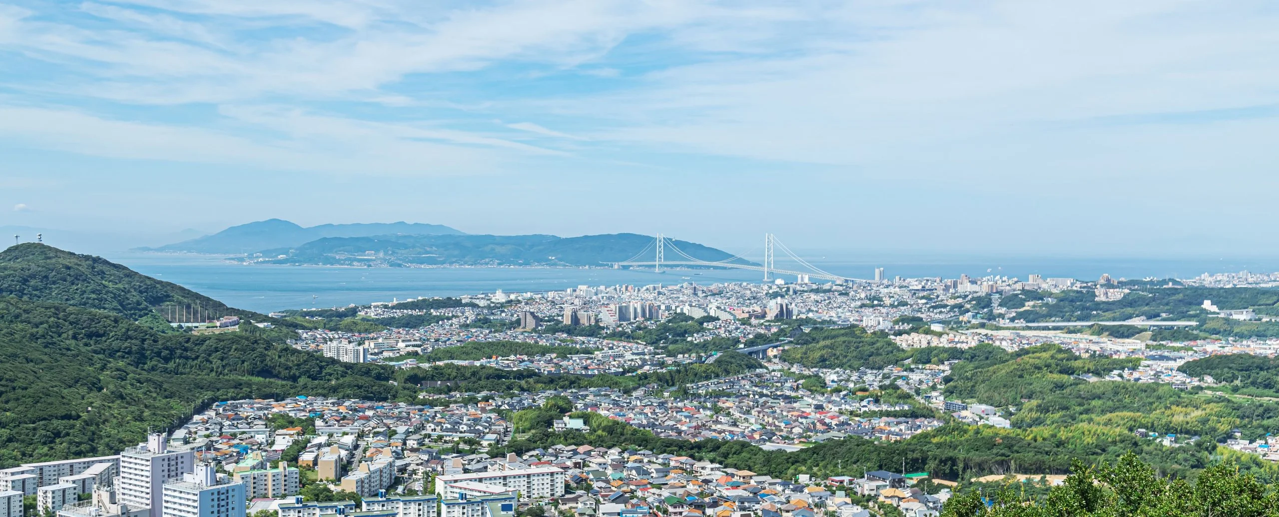 栂尾山頂上には、木製の展望デッキ。右手には明石海峡、左手には神戸の街並みから大阪湾まで見渡せるビューポイント。