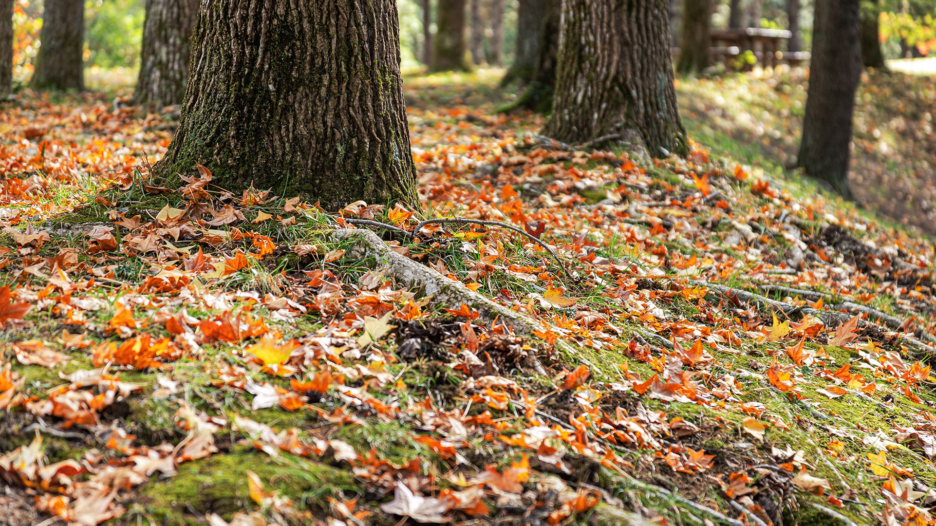 紅葉は木々の種類やエリアによって見頃が異なります。日々移り変わる森の表情をベンチに腰をかけて落葉したばかりの色鮮やかな紅葉の絨毯とともに楽しもう。