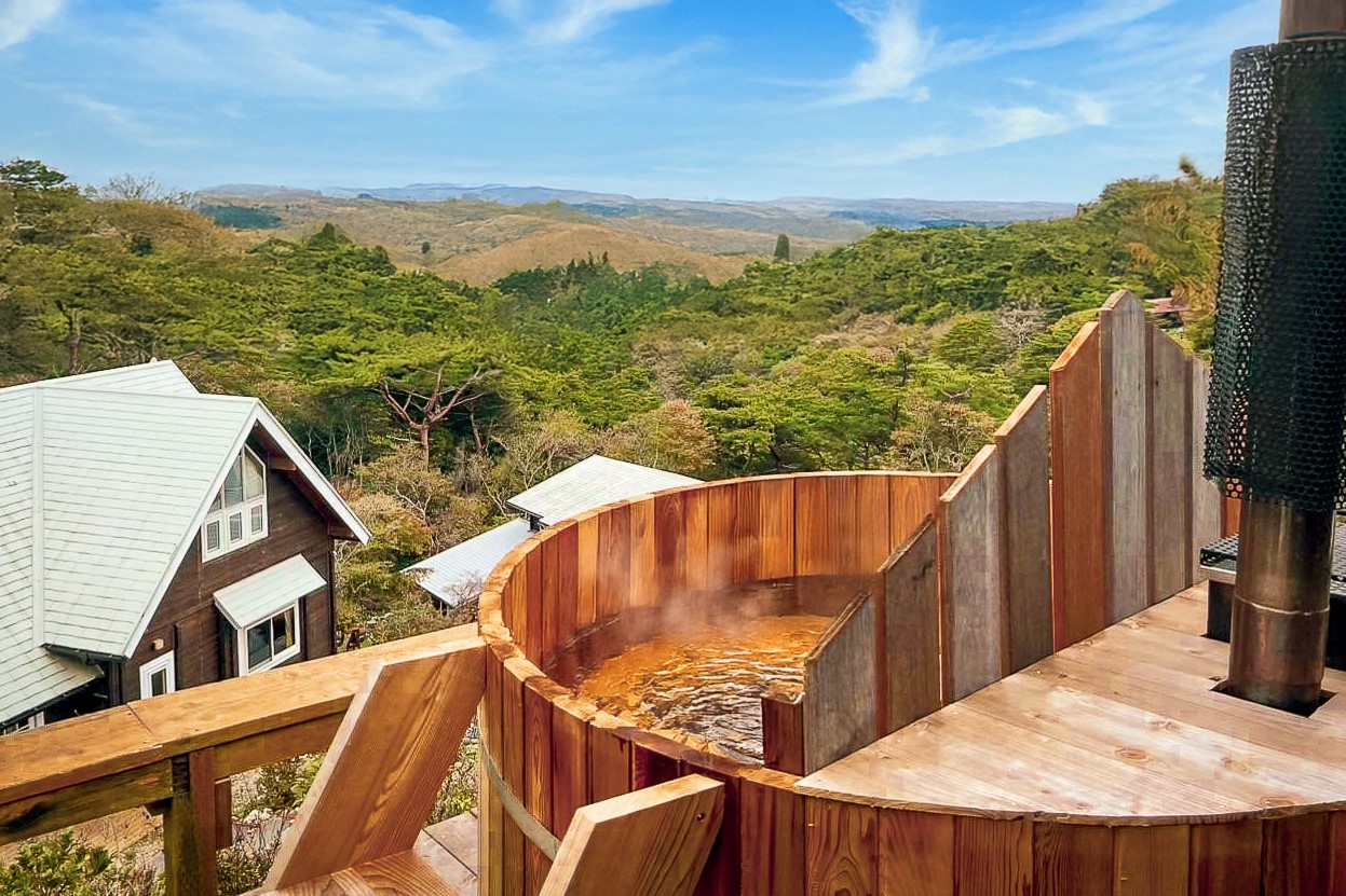 広々ウッドデッキでのアウトドアキッチン・景色を眺めながら屋外バーベキューや調理が可能な、2階建ての広々としたコテージ。