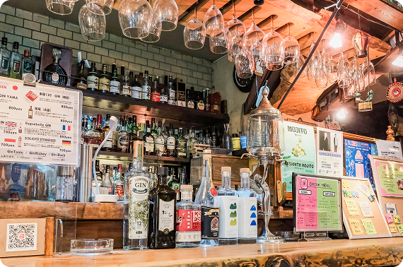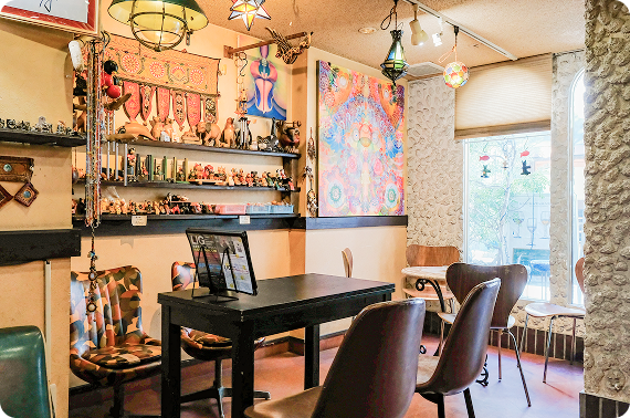 カウンターの奥には、日本酒、焼酎、ウイスキーの瓶がズラリと並び、その昔「禁断の酒」と呼ばれた歴史を持つアブサンも味わえる。飾り棚をはじめ店内の至る所に愛嬌のあるアジア雑貨がディスプレイされ、見ているだけで飽きない。昼と夜、同じ空間なのに全く違った顔を見せる不思議空間で、早朝登山後の空腹を満たすも、心地よく疲れたカラダをあふれるような音の世界に浸すも、お好みの過ごし方をどうぞ。