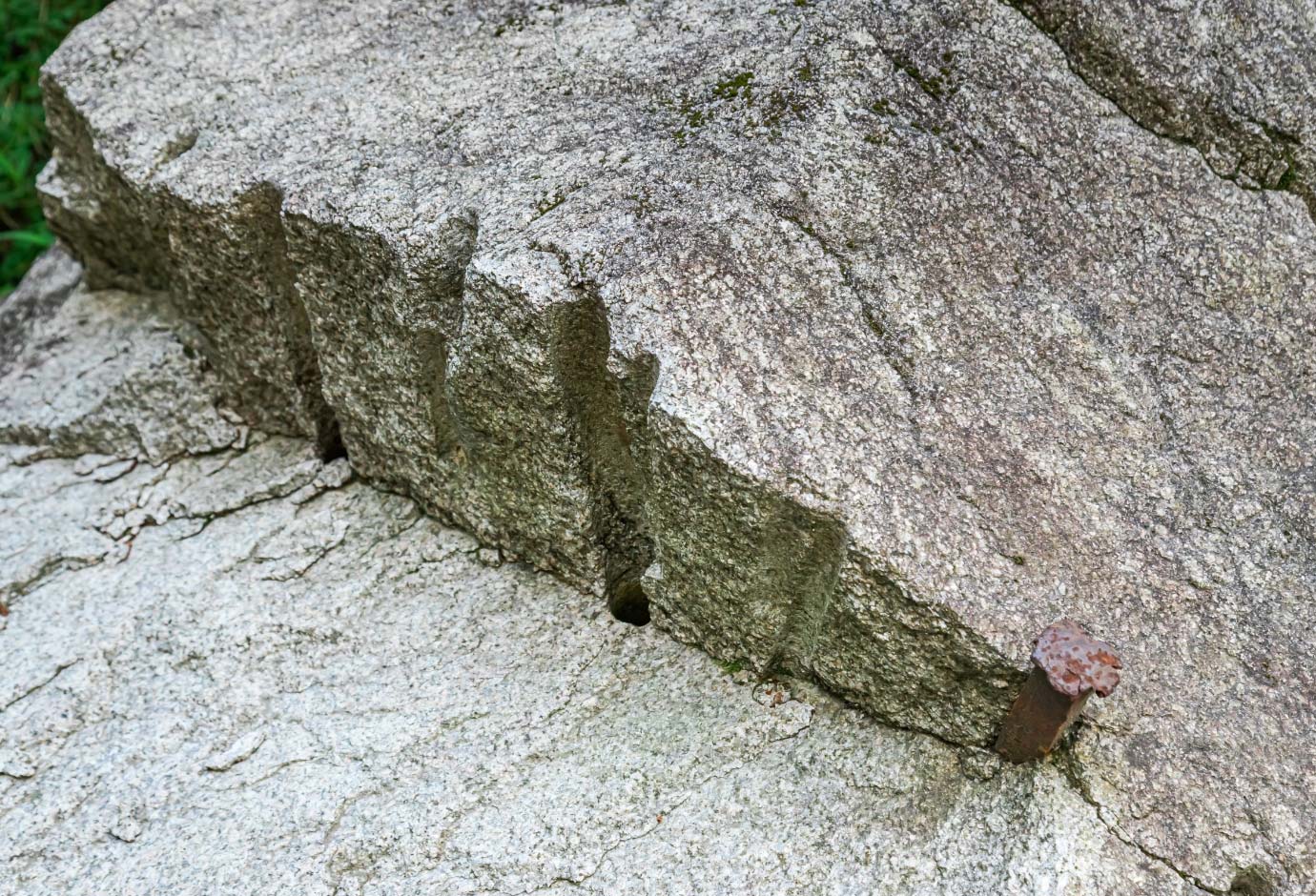在登山道途中的採石場,有一塊留有楔子痕迹的岩石,可以感受當年在這裡將石材打碎加工的痕迹。登山道的分岔點上刻着“石切道”的花崗岩路標。