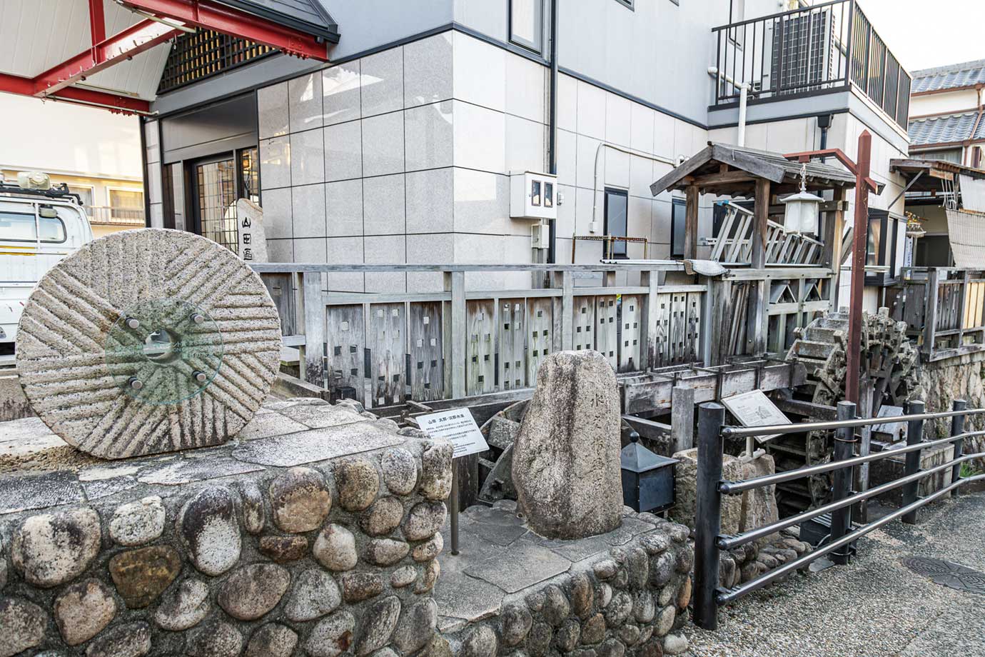 鼎盛期有近百個水車,是有水車和水路的親水空間。有大小兩個,分別被賦予了“山田太郎車·次郎車”的愛稱。