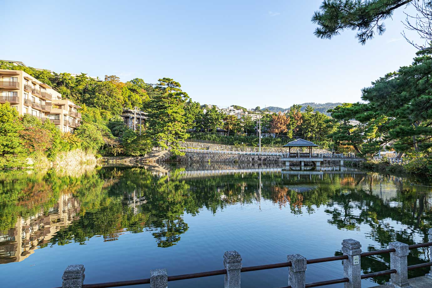 池塘周圍有長椅,景色優美,是當地人休息的地方。靠近阪急御影站,面向巴士道,交通便利。
