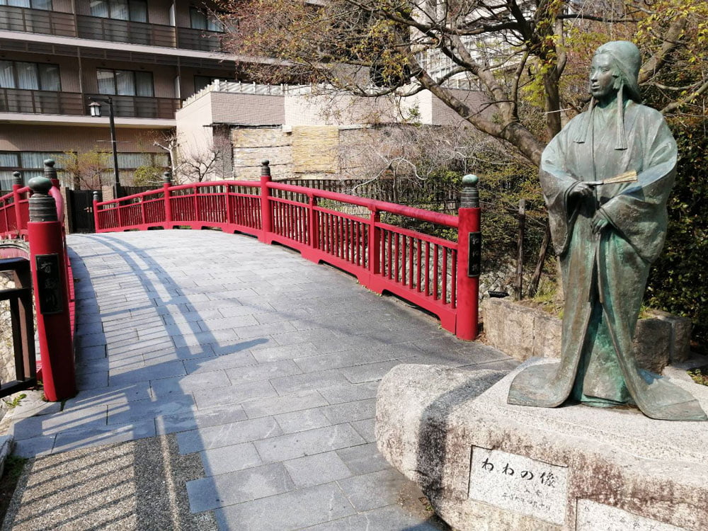 The Arima Onsen started its fame back in the 15th century as the hot spring was loved by Hideyoshi Toyotomi, one of the most famous and successful Japanese military commanders from the Sengoku period (from 1467 to 1615). Together with this historical background, there are two symbolic bridges “Taiko-bashi bridge” (“Taiko” is another name of Hideyoshi Toyotomi) and “Nene-bashi bridge” (Nene is Hideyoshi’s wife) that lay across the Arima-gawa River near the Kobe Electric Railway “Arima Onsen Station”.