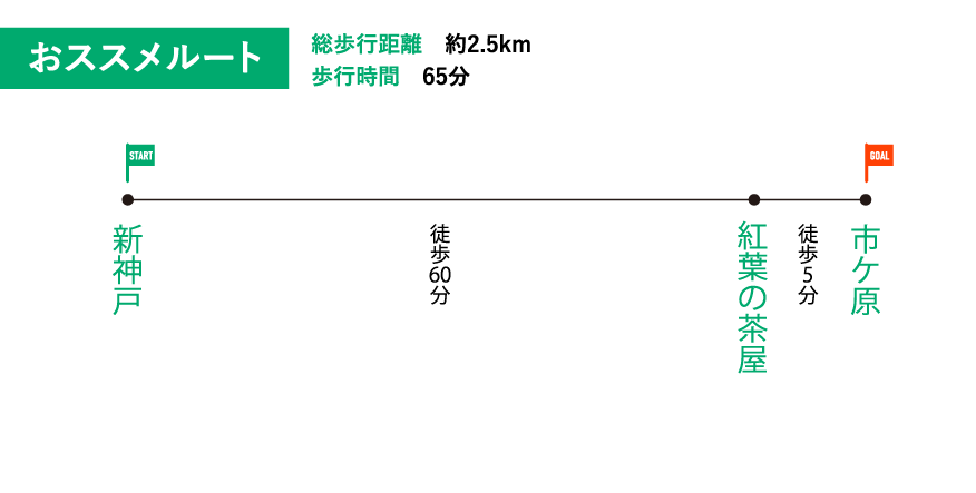 登山王道の道、新神戸を出発にして市ケ原を目指し目的にあった山道へ向かう多くのハイカーが行き交う。整備された道で、観光スポットである布引の滝にも立ち寄れる。ちいさなお子様もご家族一緒に登山を楽しめるコース。